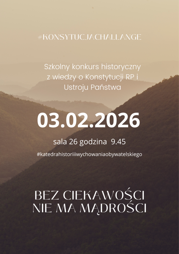 #katedrahistoriiiwychowaniaobywatelskiego zaprasza w najbliższy wtorek 03.02.2026 o 9.45 chętnych uczniów na szkolny konkurs historyczny – Konstytucja RP i ustrój państwa #konsytucjachallenge2026. 28 stycznia 2026 Udostępnij Share on FacebookShare on Facebook Share on XShare on X Zobacz teżAkcja Żonkile – „Łączy nas pamięć”18 kwietnia 2026PRE ZERO ARENA GLIWICE – DZIĘKUJEMY ZA SPORTOWE EMOCJE17 kwietnia 2026MECZ FUTSAL PIAST GLIWICE17 kwietnia 2026Dni Zdrowia13 kwietnia 2026